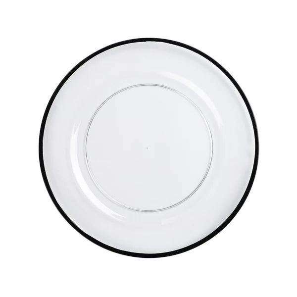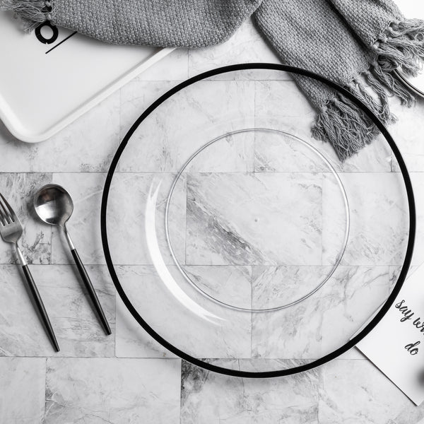 Ensure the details of your place setting aren't forgotten and complete your tablescape with our stunning Alpine Acrylic Charger Plate - Black Trim! Made of durable acrylic with a trim rich in color, these charger plates are a statement piece to guarantee your event is chic and modern. Not only do they look fabulous, but they're also functional and can save your tablecloth from possible stains. Charger plates are purely for decor, so be sure to place dishware on top. These modern charger plates pair perfectly with our Satin, Glitz, Taffeta, Lamour, Pintuck, or Polyester napkins to really elevate your decor!