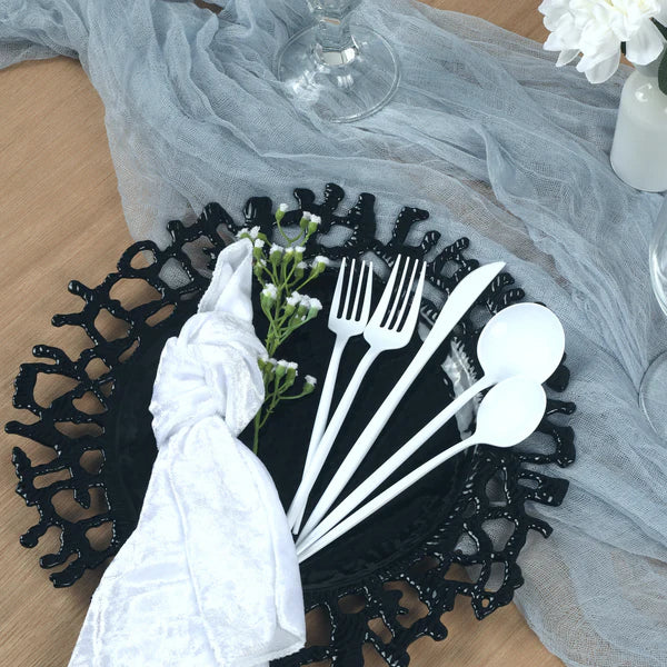 These plates are made of acrylic, a naturally transparent glass-like material tinted in rich black. This lightweight material is easy to handle for servers and decorators. Not only do they look fabulous they also serve to keep food droppings off your tablecloths to avoid stains. They are also a durable option for guests to enjoy a hassle-free and stylish dinner.