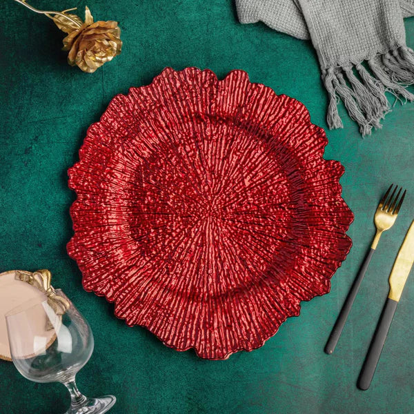Hypnotic, distinct, bold. These are but a few words that capture the exceptional design of our sensational Reef Acrylic Plastic Charger Plate. In a vibrant color palate with a textured, reef-like motif, this eye-catching plate makes an excellent addition to your serveware collection. The solid color pattern of our reef charger plate makes an effortless accompaniment to your every party theme. Their exquisite elegance is bold and beautiful and will enhance the appeal of your table setting. The breezy, sea-side inspired design is perfect for a beach-side event while also serving to add depth and dimension as a display plate. Pair your chosen color with sea glass-tinted apothecary jars, candleholders, or vases, then round out the look with a meaningful floral centerpiece. Perfect for upscale restaurants and catering events, this sophisticated charger plate lends a contemporary touch to every setting, event, and decor style with ease. Whether a large setting or event that deserves the proper elegance and prestige, or a small venues perfect for executing a dramatic touch to remember, this brilliant reef charger plate accomplishes a timeless look with luxe styling, rich finishing and a striking textile. Bring out your inner party planning diva with a servewear plate perfect for dinner parties, weddings, anniversaries, birthday parties, housewarmings and more!